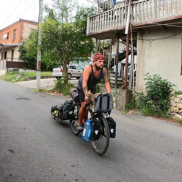 Jeg var virkelig i vildrede, da jeg så hende i siden af vejen. Mit hoved sagde, at det var vanvittigt at tage katten med på en cykeltur rundt om jorden. Hvordan skulle jeg tage mig af hende? Det ville være for stort et ansvar, og de planer, jeg havde lagt, kunne jeg så godt glemme alt om. Men mit hjerte sagde, at jeg ikke bare kunne efterlade hende i naturen sådan uden videre. Hun var så skrøbelig og sårbar. Jeg ville aldrig have tilgivet mig selv, hvis der var sket hende noget. I sidste ende vandt mit hjerte. Og så snart jeg trådte i pedalerne, og hun hoppede op på min skulder som en lille andenpilot, var det endeligt afgjort. Det var da klart, at hun skulle med mig. Jeg vidste, at vi var venner.